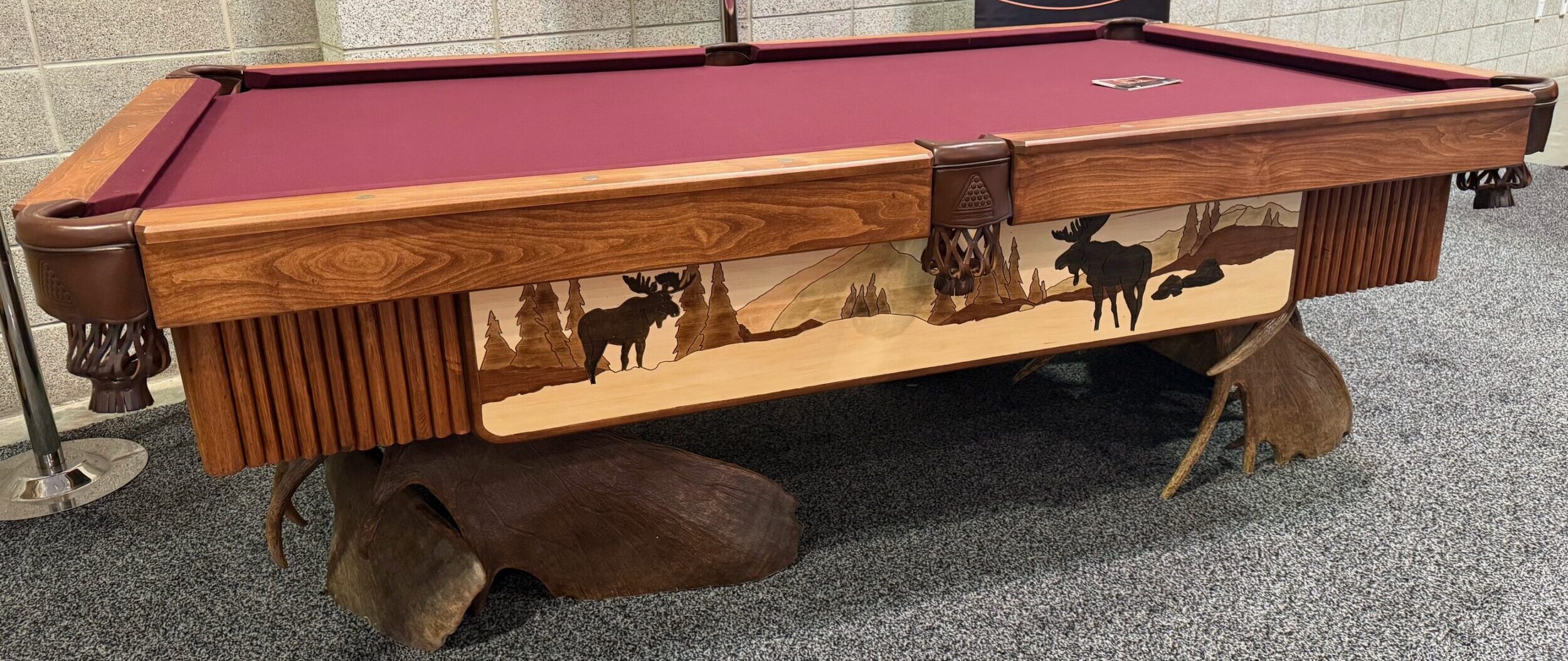This custom-built pool table features a cabinet meticulously adorned with intricate wood marquetry, depicting a serene mountain landscape with silhouette moose inlays. The table is anchored by massive, authentic moose antler trophies that serve as a natural, rugged foundation.