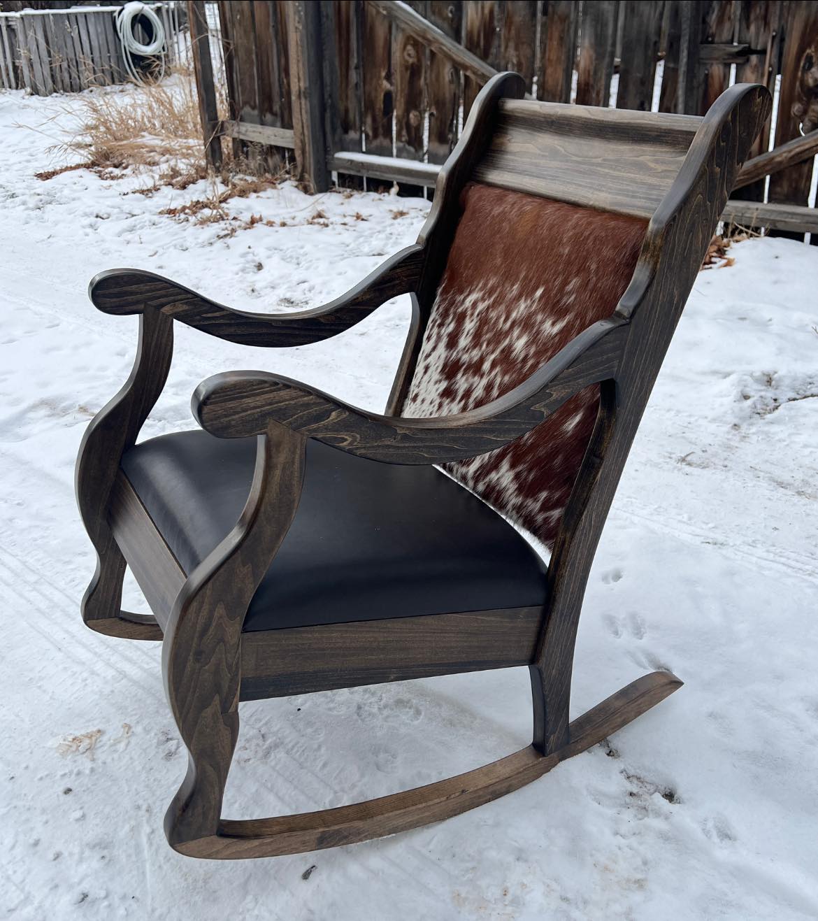 Rocking chair is constructed with a solid hardwood frame, top grain dark brown leather upholstery and cowhide yoke.